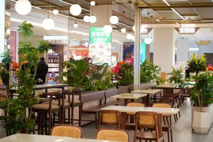 市集整体采用错落有致的空间布局,划分特色餐饮区、休闲社交区等功能板块,动线设计流畅且富有层次感;同时融入潮流灯光、生机绿植、艺术装置等元素,搭配金属线条现代造型与环绕绿植打造共享就餐、休闲休憩区,让冰冷的地下空间蜕变为集消费、体验、社交于一体的“生活剧场”,兼具烟火气息与年轻社交属性。