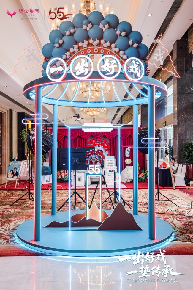 戏韵为媒,匠心为核。穗宝以“戏”为文化纽带,将戏剧美学与品牌发展深度绑定,现场设计巧妙融合戏剧、戏曲美学与现代轻奢风格,经典戏服纹样搭配浅青蓝的春日色调,旦角、凤凰、蝶莲等东方元素错落点缀,让传统韵味与当代审美完美相融,不仅打造出极具视觉美感的发布会现场,更以戏剧文化赋能产品IP,让穗宝55年的发展历程成为一场厚积薄发的品牌大戏。