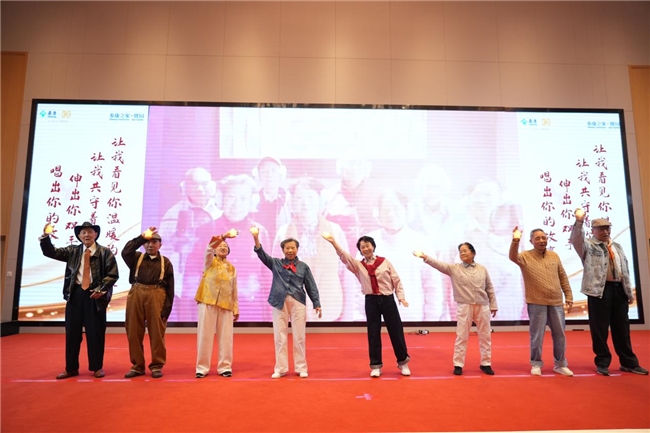 舞台之上,30余位平均年龄超75岁的长辈为在场观众送上视听盛宴。不仅有乐泰学院古典舞课程学员优雅的古典舞《山海逢》、朗诵课堂成员真挚的齐诵《赣园四载 岁月沉香》;乐泰俱乐部民乐小组的器乐表演《世间始终你好》;更有由新老居民、居民义工讲师代表带来的表演唱《赣园会更好》;护理公寓长辈与员工代表携手献上的暖心手势舞《让世界充满爱》,尽显银发岁月风采。