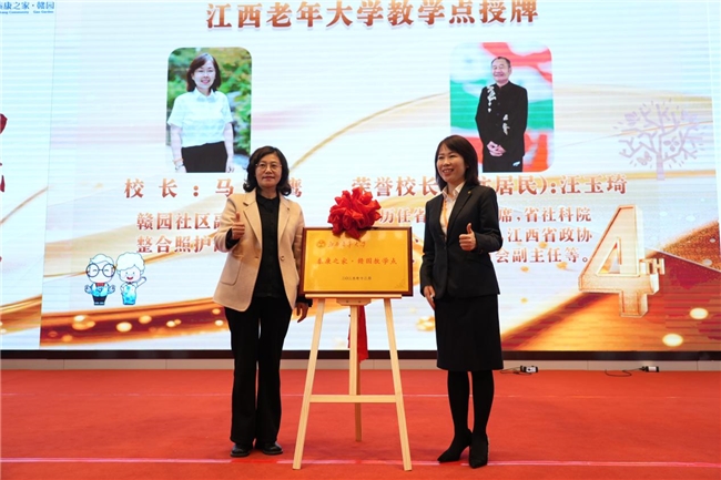 在全体来宾的共同见证之下,居民代表上台向赣园四周岁生日珍贵献礼;活动现场还对万婷荣获的“全国敬老爱老助老先锋模范人物”荣誉进行了表彰;同时举行江西老年大学赣园教学点揭牌仪式,标志着赣园文化养老迈向新的高度。
