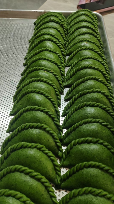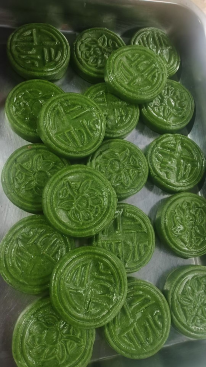 2. 制皮工艺:将新鲜艾草焯水去除苦涩味后,捣成细腻的艾泥,再与优质糯米粉、少量粘米粉按合适比例反复揉和。揉制好的面皮色泽青绿透亮,兼具软糯口感与韧弹质感,既不粘牙,也不易因蒸制而变形,是艾米果好吃的关键。